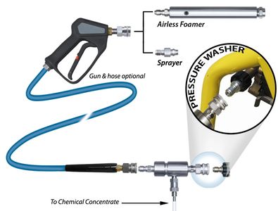 Lafferty Pressure Washer Foamers use a pressure washer to dilute chemical concentrate and project wet, clinging foam. Pressure Washer Foamers feature a stainless steel injector body and airless foam wand that are balanced to achieve maximum foam throw distance and superior overall performance. Wash bay equipment is available in a variety of configurations for various cleaning goals and equipment setups.